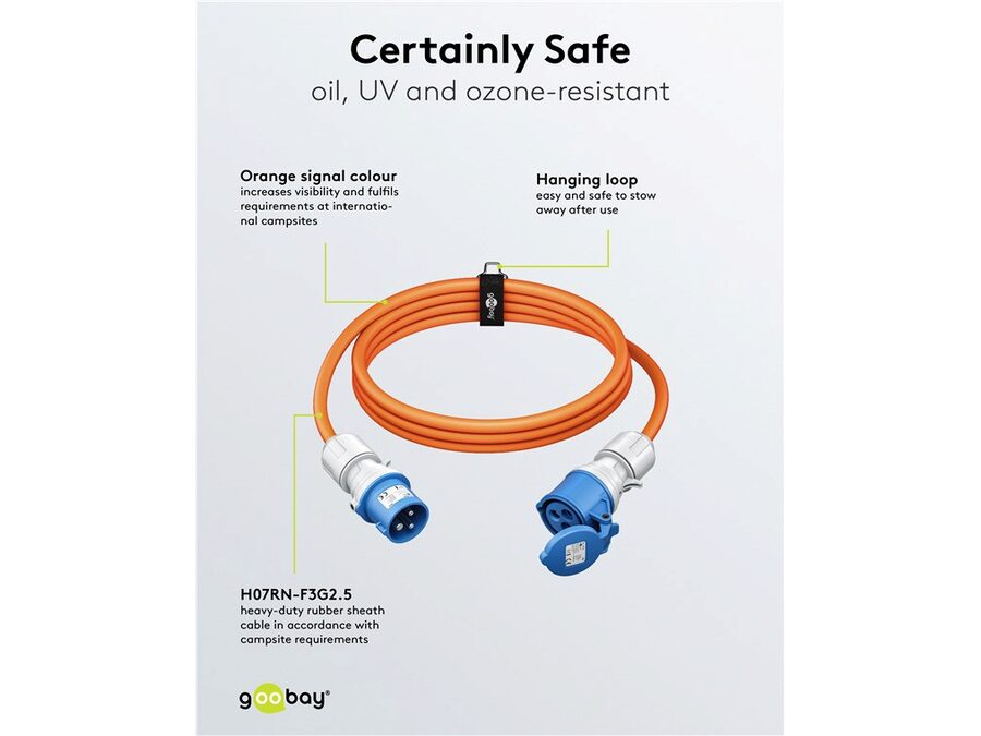 - The orange signal colour of the power cable ensures increased visibility and meets the safety standards on international campsites