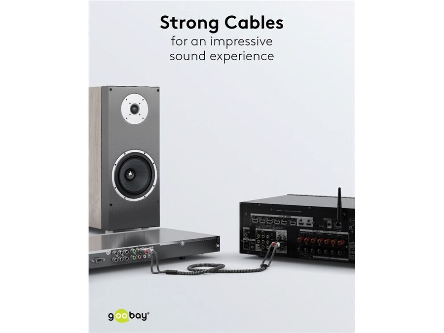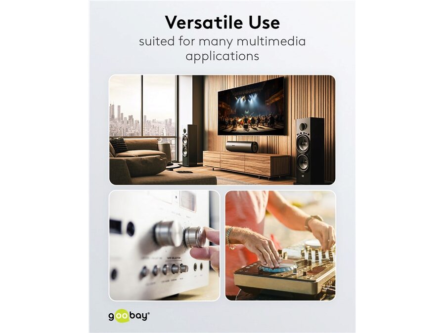 The Goobay Plus series comes in a slim, elegant metal design in Sharkskin Grey. The stereo RCA cable is perfect for multiple purposes - whether on a subwoofer, Blu-ray player, mixing console or hi-fi system. The high-quality, robust plugs are also suitable for frequent connecting and disconnecting.
